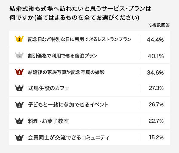 また、結婚式後も式場へ訪れたいと思うサービス・プランについては、1位「記念日など特別な日に利用できるレストランプラン」44.4%、2位「割引価格で利用できる宿泊プラン」40.1%、3位「結婚後の家族写真や記念写真の撮影」34.6%と続きました。