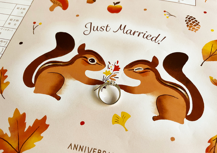 秋の豊かな実りを象徴する、イチョウの葉や木の実などをあしらった婚姻届です。プロポーズする可愛いらしいリスが、おふたりの新しい門出を祝福します。