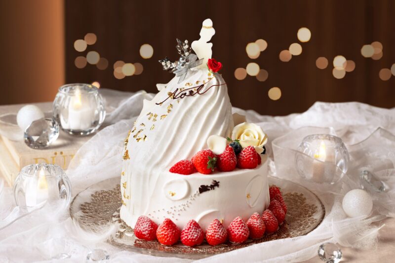 [ 商品紹介 ]:花嫁の美しい後ろ姿をイメージし、繊細なクリームで仕立てた純白のドレスに苺の赤を添え、“幸せの象徴”とされる純白と赤を表現した特別な2段ケーキです。側面には祝福を象徴する天使の羽をあしらい、花嫁の隣にはチョコレートを1枚ずつ重ねた薔薇を添え、華やかさと気品を演出しました。普段から結婚式のケーキを手掛けるウェディングパティシエだからこそ叶う、細部にまでこだわったデザインです。上段のチョコレートケーキと下段のショートケーキを組み合わせることで、味わいの変化も楽しめる贅沢な仕立てに。サンタクロースとトナカイのチョコレートが、クリスマスの特別な一日をより鮮やかに彩ります。アニヴェルセルカフェ 表参道で展開している「ローブ ド マリエ」シリーズが、クリスマスケーキに。1年に一度だけ出会える「ノエル・ローブ ド マリエ」をぜひご堪能ください。